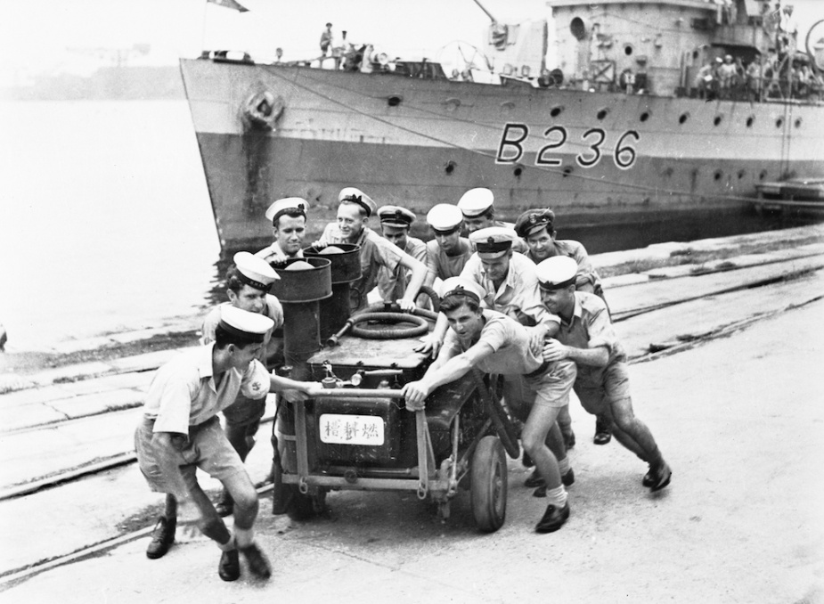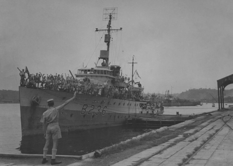 Ballarat (I) took part in the surrender ceremony at Tokyo, after which she was engaged in minesweeping in the Hong Kong area with the 20th and 21st Minesweeping Flotillas. She was damaged by a mine at Amoy on 6 November, and returned to Melbourne on 13 December where the ship’s company went on long leave. At the conclusion of hostilities Ballarat (I) had steamed 130,000 miles.