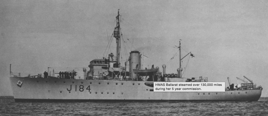 HMAS Ballarat (I) was one of sixty Australian Minesweepers (commonly known as corvettes) built during World War II in Australian shipyards as part of the Commonwealth Government’s wartime shipbuilding programme. Twenty (including Ballarat (I)) were built on Admiralty order but manned and commissioned by the Royal Australian Navy. Thirty six were built for the Royal Australian Navy and four for the Royal Indian Navy.