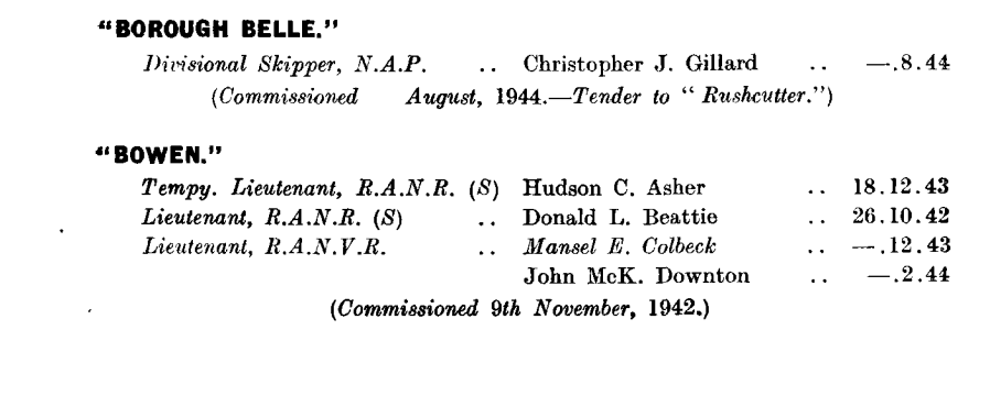 Borough Belle was a 48 foot Motor Cruiser that served as a Naval Auxiliary Patrol and Combined Operations Training vessel. The boat was requisitioned by the Australian Government on 6 August 1942, before being commissioned into the RAN on 13 December 1943. HMAS Borough Belle was decommissioned on 4 September 1945 and later sold.