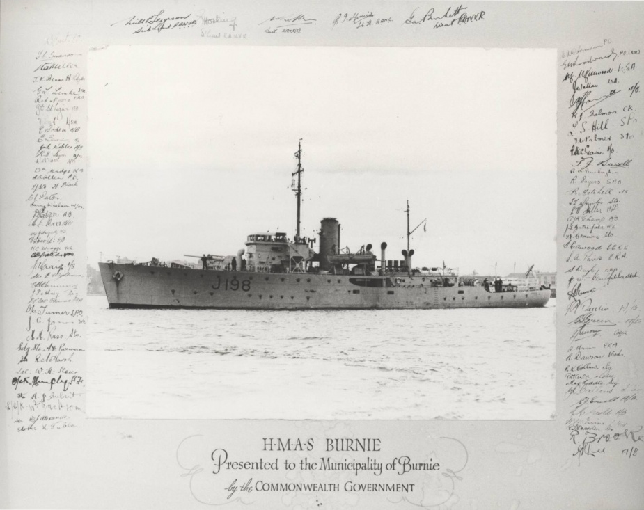 HMAS Burnie was one of sixty Australian Minesweepers (commonly known as corvettes) built during World War II in Australian shipyards as part of the Commonwealth Government"s wartime shipbuilding programme. Twenty (including Burnie) were built on Admiralty order but manned and commissioned by the Royal Australian Navy. Thirty six were built for the Royal Australian Navy and four for the Royal Indian Navy.