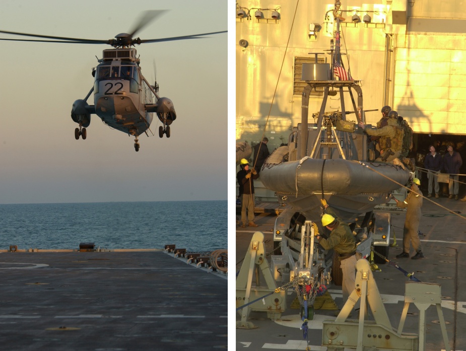 From 17 to 19 March, Kanimbla also supported Sea King, early warning helicopters operating from the aircraft carrier HMS Ark Royal. When hostilities began on the evening of 19-20 March 2003, Kanimbla played a pivotal part in intercepting Iraqi vessels and was the controlling and coordination vessel for the hundreds of patrols conducted in the Khawr Abd Allah waterway. Kanimbla also provided round-the-clock support for Coalition helicopters while her own Sea King helicopter provided logistic support to other Coalition vessels and Australian Clearance Diving Team Three ashore in Iraq. Later, Kanimbla became the first Coalition vessel to supply urgently needed medical supplies to civilian hospitals in Baghdad.