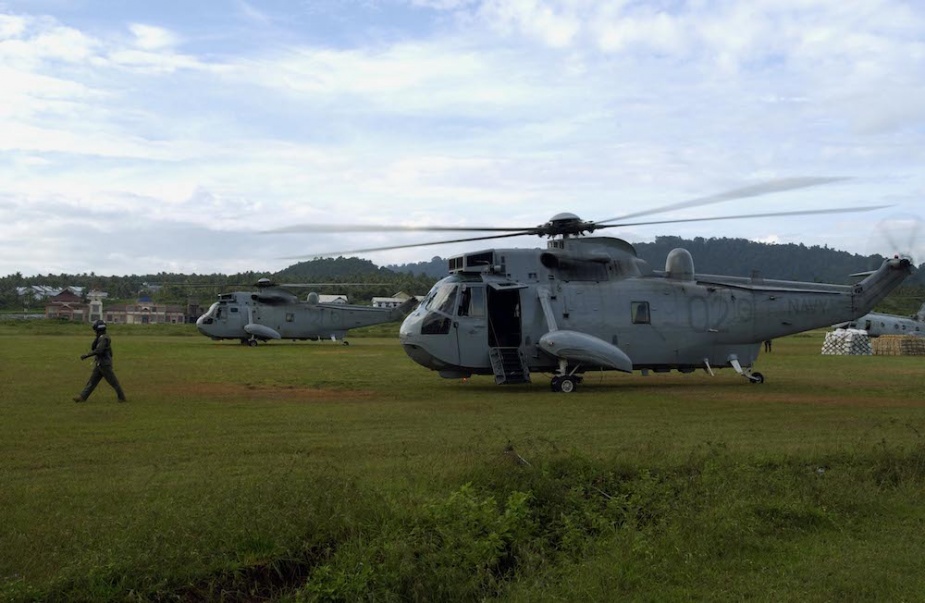 Kanimbla"s two embarked Sea King helicopters, Shark 21 and Shark 02, ashore at Banda Aceh. The loss of nine ADF personnel in Shark 02 was a devastating blow to the ADF.