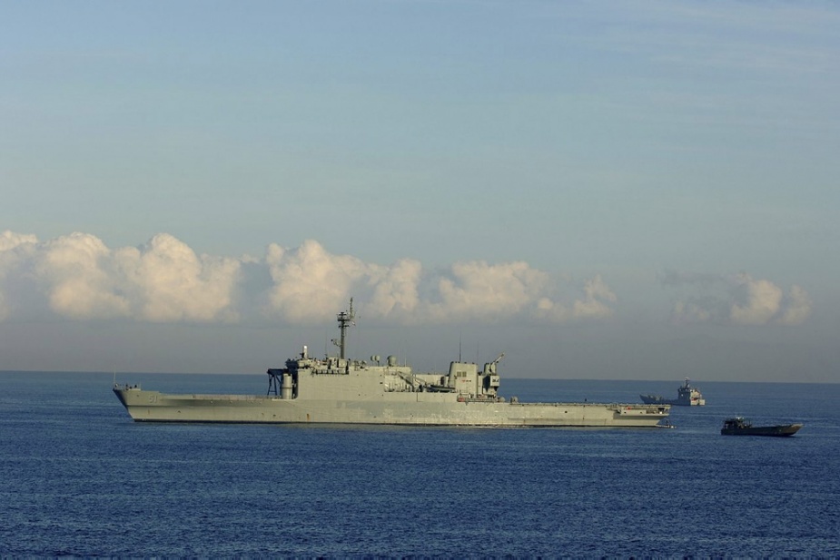 HMAS Kanimbla lies at anchor off the coast of Dili, Timor-Leste, during Operation ASTUTE.