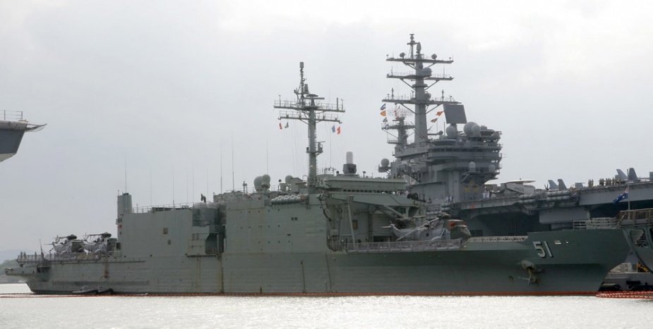 Kanimbla dwarfed by the USS Ronald Reagan, Pearl Harbor, 2010