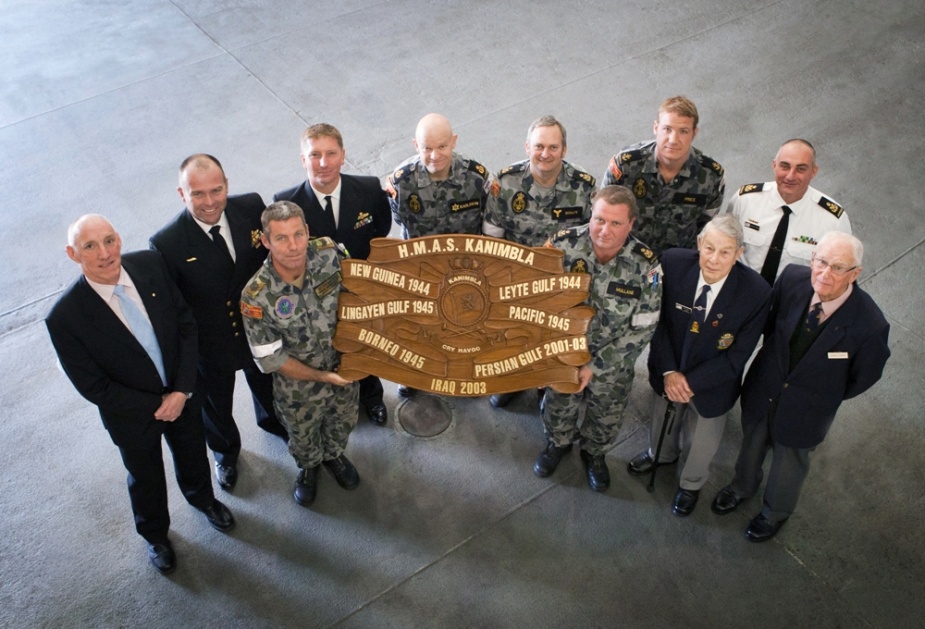 Captain Dave McCourt, RAN (Ret"d), Commander Timothy Byles, RAN, Commander Greg Swinden, RAN, Sten Karlsson, Glen Schultz, Lynton Price, Stephen Kypreos, Front row - SGT Andrew Bayly, Bernard Mullane, Mr Keith Bray and Mr Don Dykes former Kanimbla (I) crewmen. The battle honour board displayed in this image represents all the battle honours won by RAN ships to carry the name Kanimbla. The men in the photo were each present in at least one of the operations reflected on the board.