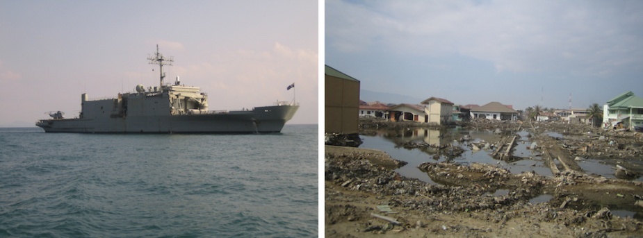 Left: Kanimbla with one of her Sea King helicopters ranged on deck off the coast of Banda Aceh. Right: The devastation ashore. (Images courtesy of CMDR Bruce Greig, RANR)