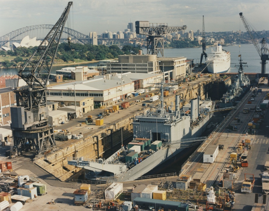 Kanimbla in Captain Cook Graving Dock, Garden Island, in the initial stages of her modernisation.