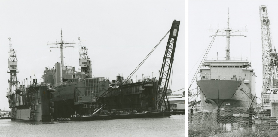 Left: Kanimbla and Manoora under the tow of the tug Elsbeth II (Scott Hooper). Right: Kanimbla passing through the New Orleans flood gate (Scott Hooper).