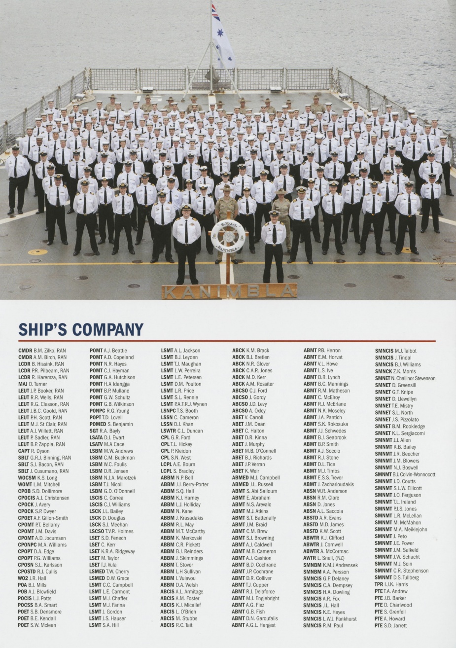 Kanimbla entered the Middle East Area of Operations on 2 December, and on 8 December she assumed the duties of Commander Task Group. Between December 2001 and March 2002 Kanimbla was actively involved in operations in the Persian Gulf which ranged from the provision of boarding parties and the transfer of vehicles, to acting as a forward operating base for US Navy SEAL teams. Kanimbla"s return voyage to Australia saw her visit Thailand, Singapore and Cairns before arriving in Sydney on 3 April to a warm welcome from family and friends.