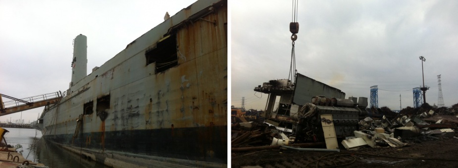 Left: Kanimbla"s hull beached in the breakers yard (Marsha Coates). Right: A large piece of Kanimbla is craned ashore beside one of her engines (Marsha Coates).