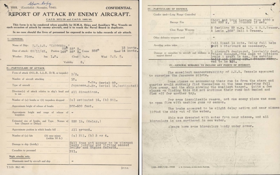 Twice in this period she was attacked by Japanese aircraft. On 28 November 1942, off Buna in company with her sister ship HMAS Ballarat, she was fortunate to escape serious damage when ten dive bombers made a determined assault on the two ships. Again in January 1943, six aircraft attacked Katoomba and her convoy, the Dutch ship Van Heutz. Katoomba suffered only superficial damage but the freighter received a direct hit which killed one man and seriously wounded three.