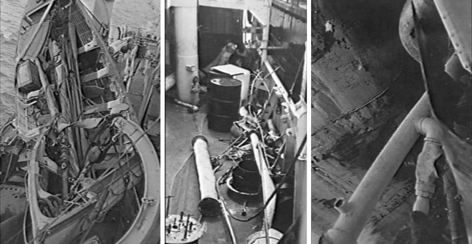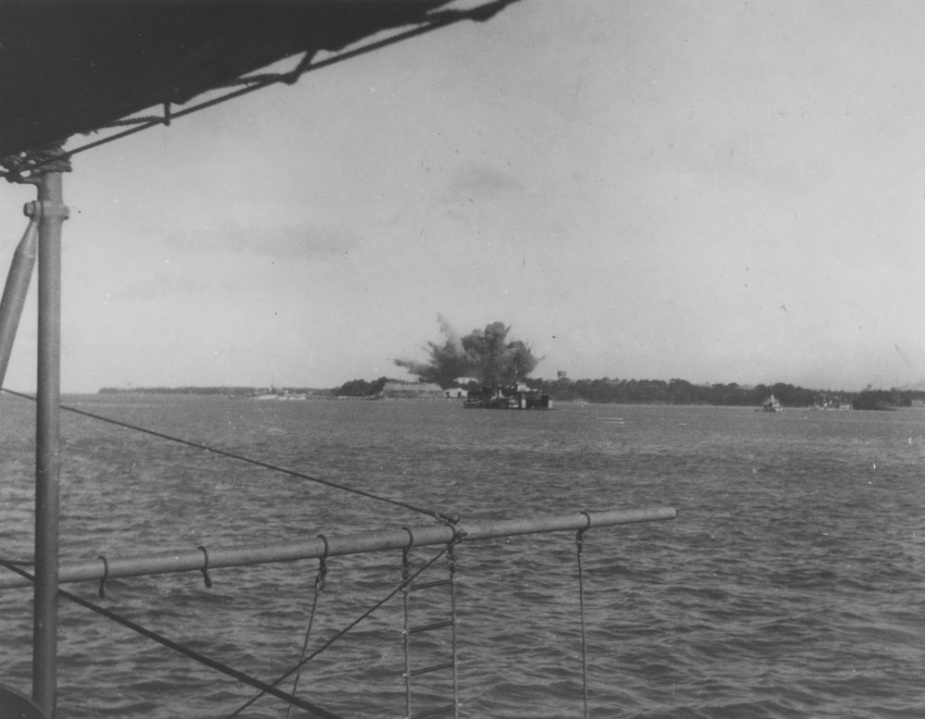 Katoomba’s Commanding Officer wisely decided not to de-ammunition, as was usually the case when docking for repairs, and on 19 February, when the first of the Japanese air raids on Darwin began, Katoomba’s ship’s company manned their weapons putting up a spirited defence. The corvette was showered with debris when the merchant vessel Neptuna exploded and survived a near miss when a bomb released from an attacking enemy aircraft narrowly missed the ship and the dry dock in which she was held fast. Nineteen ships were either sunk, put out of action or damaged in the raid. Remarkably, Katoomba and AD1001 escaped serious damage.