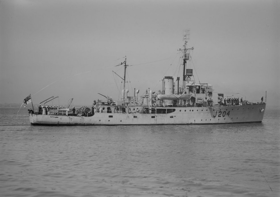 HMAS Katoomba was laid down at Poole & Steel Ltd, Sydney, on 9 September 1940. She was launched by Mrs Lloyd, the Deputy Mayoress of Katoomba on 16 April 1941 before commissioning on 17 December 1941 under the command of Commander Alan P Cousin RANR(S). Katoomba was the first RAN ship to carry the name of the Blue Mountains township, situated some 110 kms west of Sydney.