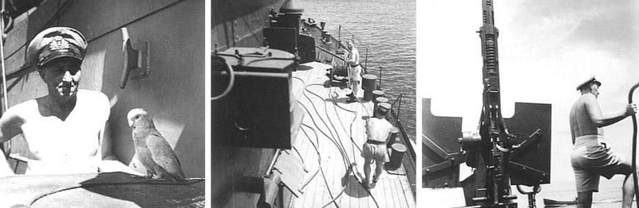 Left: Engineer Lieutenant JD Davidson and the ship"s parrot (AWM 078150). Middle: Ratings checking the rewinding wire ropes on the winch drum. (AWM 078158) Right: The Officer of the Watch aboard Kiama. (AWM 078159)