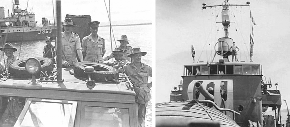 Left: His Royal Highness, the Duke of Gloucester, Governor-General of Australia, coming in on a launch at Motupena Point for an inspection of 3 Division Area, circa July 1945. L-R: unidentified; unidentified; His Royal Highness, the Duke of Gloucester; Lieutenant-General VAH Sturdee, General Officer Commanding First Army; unidentified; Lieutenant-General SG Savige, General Officer Commanding 2 Corps. HMAS Kiama can be seen in the background (AWM 093678). Right: The bridge and mast of Kiama, as seen from the forecastle. (AWM 078155)