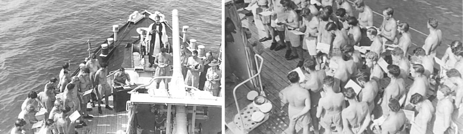 A navy church service being conducted on board HMAS Kiama in Bougainville, circa July 1945. The service was conducted by Chaplain FO Hulme-Moir, Headquarters 2 Corps. Personnel from HMAS Lithgow and HMAS Dubbo also attended the service. The organist was Lieutenant-Colonel RR Winton, deputy assistant director of medical services, Headquarters 2 Corps. (AWM 093765)