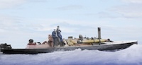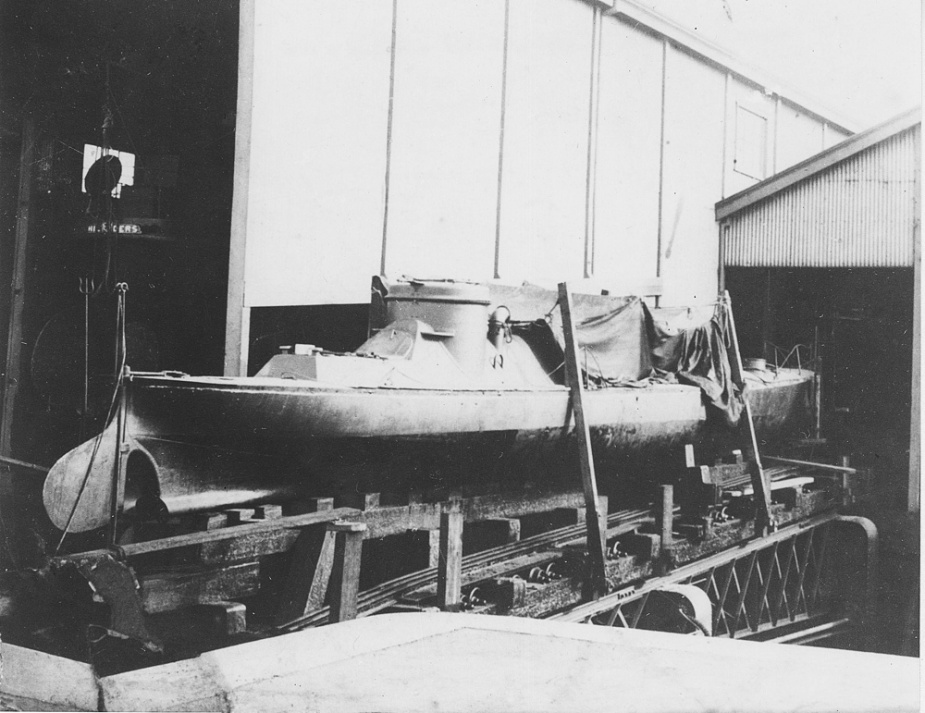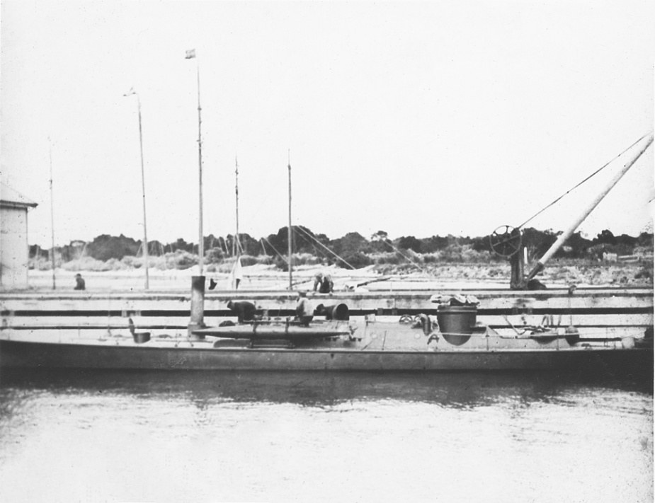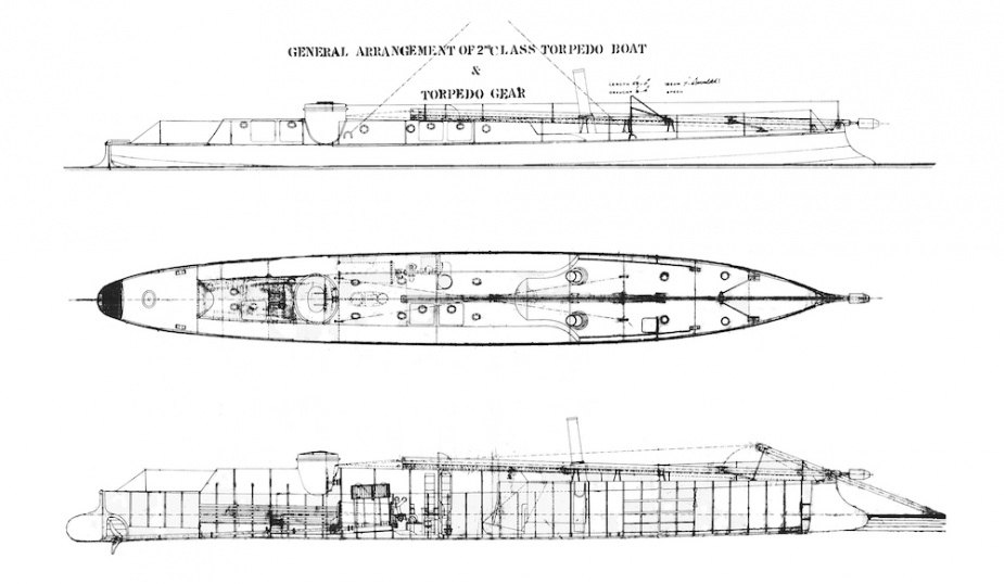 The hull is divided into watertight compartments and the forward part contains the space to be occupied by the crew. The boiler is of the locomotive type having a working pressure of 130 lb per square inch. The engines are compound surface-condensing having cylinders of 8¼ inches and 13½ inches diameter respectively with 8-inch stroke and are of 100 indicated horsepower. There are also an air pump, feed pumps and donkey pump. The fan is 2 feet 3 inches in diameter and makes about 1300 revolutions per minute. Abaft the engine room is a cabin with accommodation for two officers fitted similarly to the large boat [HMVS Childers].