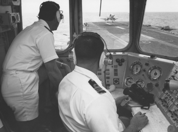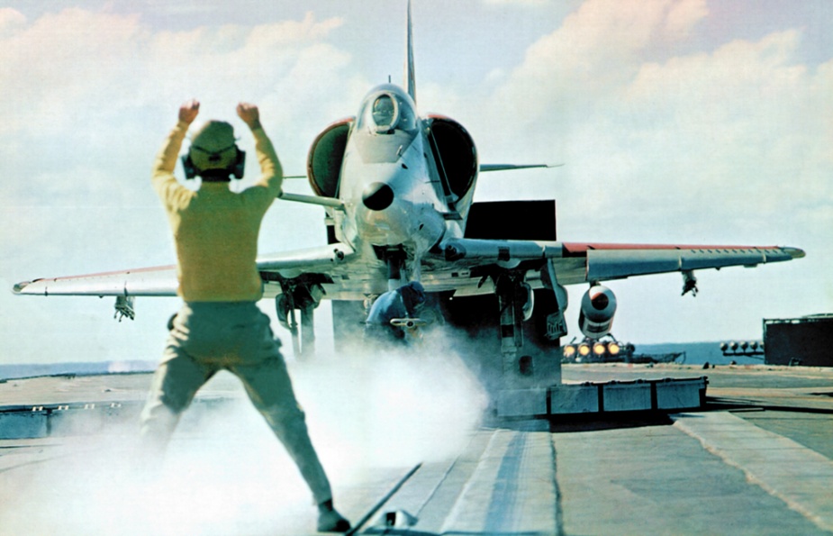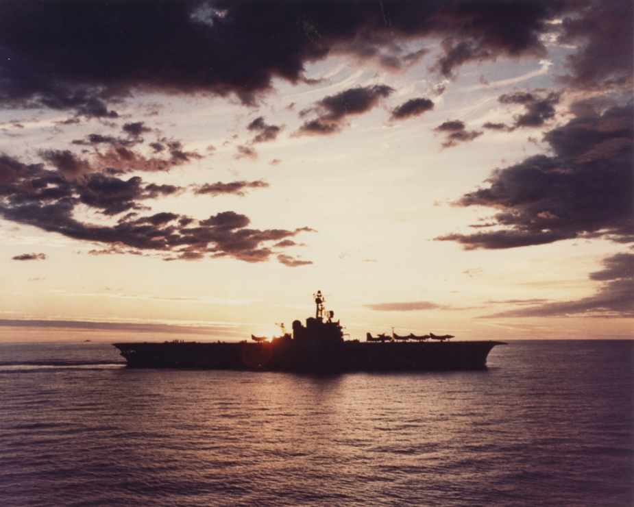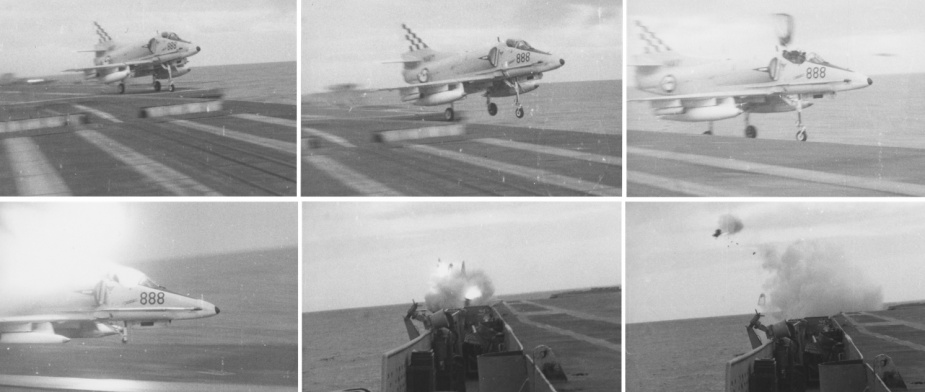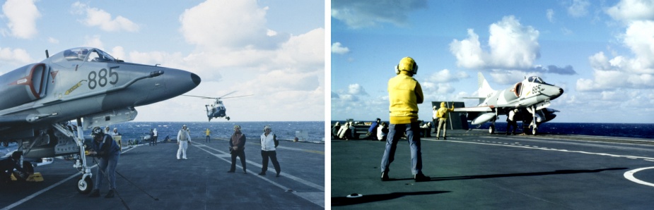 23 May turned out be a very bad day for the carrier. That morning, a Skyhawk was lost overboard when an arrestor wire parted following a normal landing and arrest. The pilot, Lieutenant Commander Kevin Finan, USN, ejected from the aircraft and was quickly recovered by the search and rescue aircraft and the ship’s Gemini dinghy.