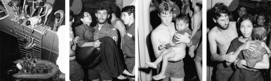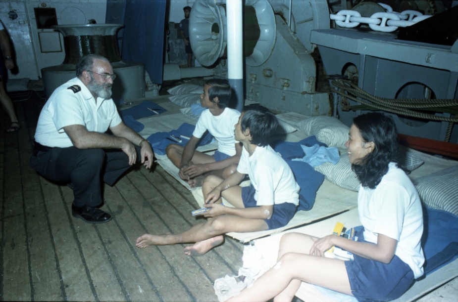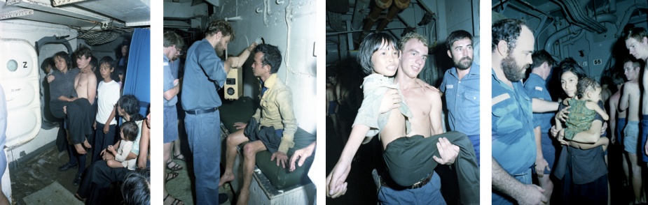 On the morning of 21 June, one of Melbourne’s Trackers sighted a vessel of Indo-Chinese origin with about 30 people on board about 185 kms from the carrier indicating that the vessel was in distress. The Tracker directed the merchant ship MV Karaka to the scene which embarked all those on board the stricken vessel. Later that afternoon, another Tracker sighted a flare and upon investigation found another overcrowded vessel indicating distress. Torrens was dispatched to investigate and found an unseaworthy vessel crowded with Vietnamese refugees with little food and water. Melbourne arrived on the scene after dark and with a combined effort from both ships’ boats, embarked 99 refugees, including 19 children aged under 10, who became known as the MG99 (Melbourne Group 99). The refugees were medically examined, provided with food, clothing and bedding, accommodated on the forecastle.