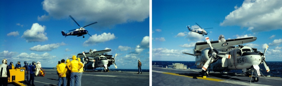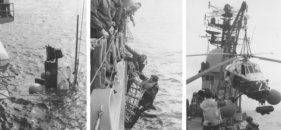 The day only got worse, however, as, while discussions were being conducted on board regarding the rescheduling of the exercise program and an investigation into the crash and the arrestor system, a Sea King helicopter ditched into the sea, striking the ship’s side and turning upside down as it fell. The forward part of the aircraft quickly submerged leaving only the tail wheel and a small section of the aft fuselage visible on the surface. Of the four person crew, the observer and aircrewman were able to evacuate the aircraft quickly through the port cabin window and were rescued by the ship’s Gemini dinghy. The pilots, however, experienced difficulties in evacuating the cockpit. They eventually escaped through the starboard side cockpit window and were rescued by another Sea King. All four crew members suffered only minor injuries, however, anxious minutes passed as the two pilots were attempting to free themselves from the cockpit and grave fears were held for their safety. Subsequent investigation found that a fracture in the tail rotor drive system led to a complete failure of the tail rotor and the consequent loss of directional control. All flying operations were cancelled until investigations into the two accidents could be completed.
