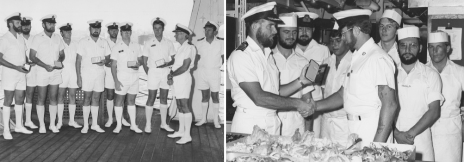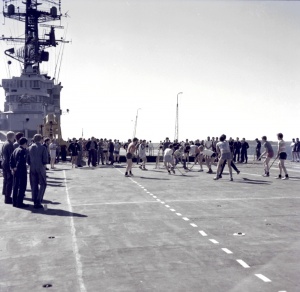 Following the conclusion of Exercise HIGHWOOD on 18 July Melbourne once again briefly came under surveillance by an Okean Class intelligence ship but proved to fast for Soviet vessel to keep up. She went on visit Rotterdam, Portsmouth and Naples before transiting the Suez Canal on 18 August. Along with Brisbane and Canterbury, she once again conducted exercises with RN and USN units in the Mediterranean and, while at Naples, a large contingent of the ship’s company attended an audience given by Pope Paul VI at Castel Gandolfo. On the morning of 16 August Melbourne fortuitously came across a French sailor who had fallen overboard from his vessel, MV Leon RE, and had spent some eight hours in the water. The sailor was brought on board and returned to his ship later in the day. After clearing the Red Sea, Melbourne went on visit Bombay, Singapore, Fremantle and Melbourne, and conducted exercises with British, French, US and Indian naval units, before arriving back in Sydney on 4 October.