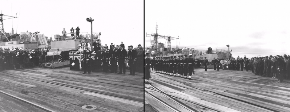 In 1945 Queenborough was transferred on loan from the Royal Navy to the Royal Australian Navy. She commissioned as HMAS Queenborough at Sydney on 20 October 1945 under the command of Commander Arnold H Green DSC*, RAN.
